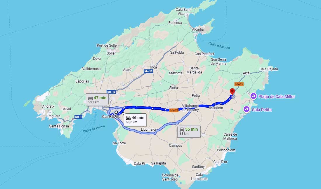 Getting to Sant Llorenç des Cardassar by car from Palma: Take the main highway from the center of Palma. Follow the highway until you find the exit for the MA-15 road towards Manacor. Continue on the MA-15. You will pass several towns such as Vilafranca de Bonany. Follow the road signs until you reach Sant Llorenç des Cardassar. The journey takes around 45 minutes to 1hour. The distance between the two towns is approximately 50 kilometers.