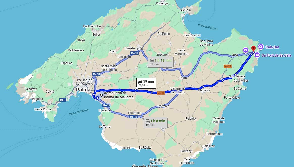 Getting to Capdepera from the airport: Capdepera is in the northeast of Mallorca, about 80 km from Palma and is easily reached by car on the main road from the airport. The most common route is to take the Ma-13 towards Inca and then follow the Ma-12/Ma-4040 towards Artà, then follow the signs for Capdepera or Cala Ratjada.